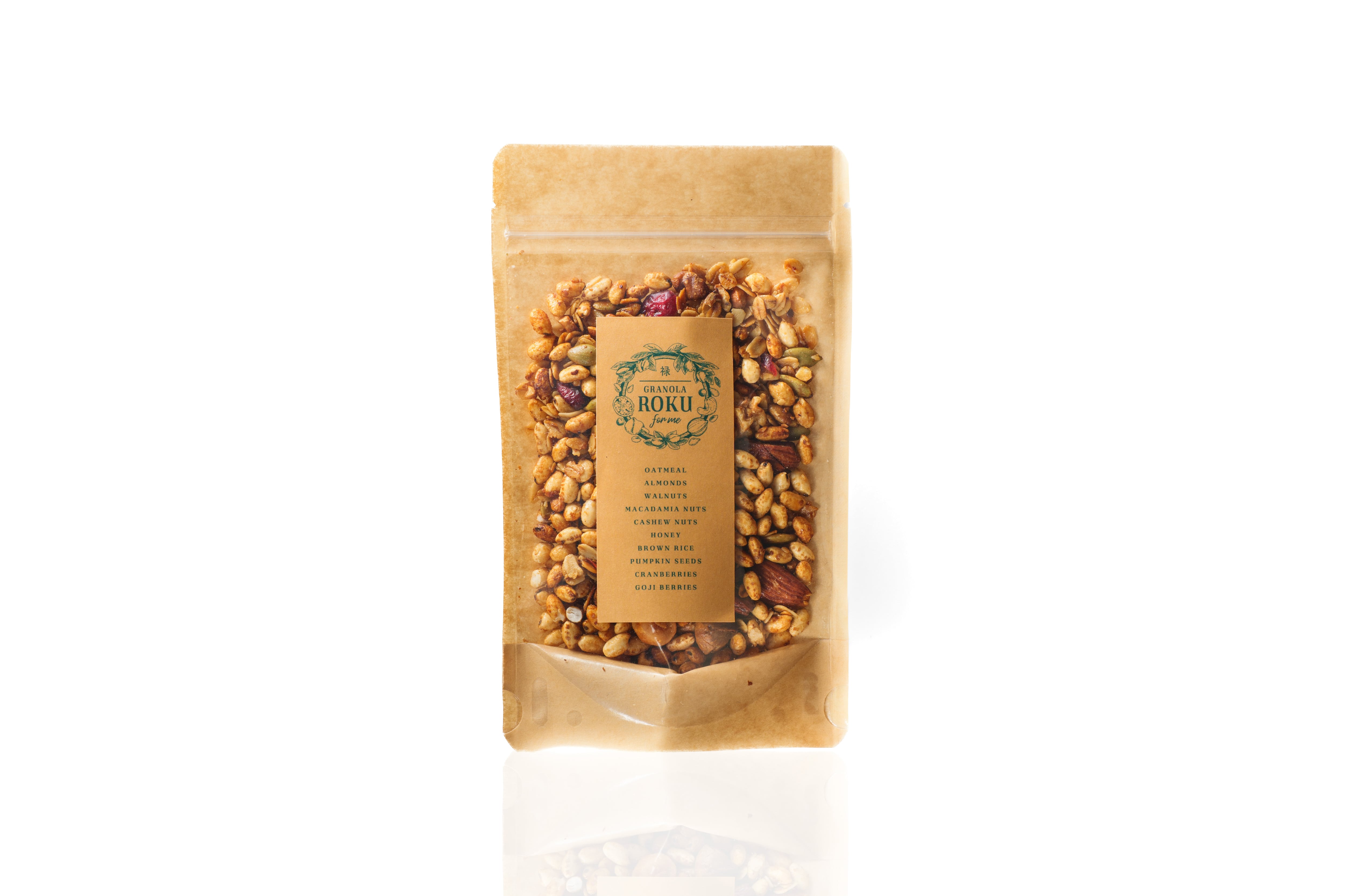 有機オートミール、有機アーモンド、有機くるみ、有機マカダミアナッツ、有機カシューナッツ、ヨーロッパ産蜂蜜、有機ココナッツオイル、京都産有機玄米、有機かぼちゃの種、有機クランベリー、有機クコの実